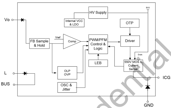 ICG(管腳 2):芯片地,同時也是內(nèi)置 MOSFET 的源極和內(nèi)置續(xù)流二極管的陰極。該管腳為芯片的內(nèi)部控制電路提供了接地參考點,并確保 MOSFET 能夠正常導通和關(guān)斷。