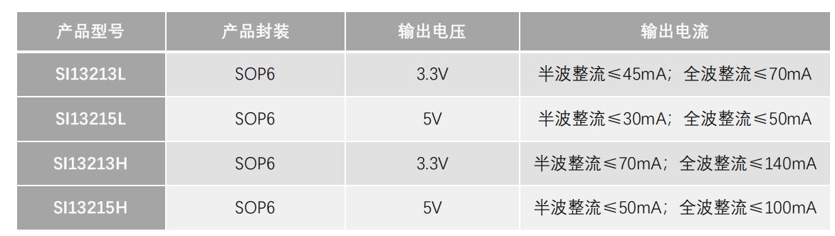 輸出電流:SI13213L在半波整流條件下的最大輸出電流為45mA(L版本)和70mA(H版本),全波整流條件下分別為70mA和140mA。SI13215L在半波整流條件下的最大輸出電流為30mA(L版本)和50mA(H版本),全波整流條件下分別為50mA和100mA。可見(jiàn),SI13213L/H的輸出電流能力略高于SI13215L/H。